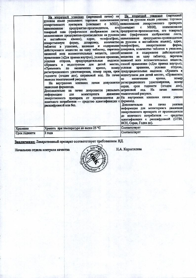 Вспомогательные вещества: целлюлоза микрокристаллическая - 82,6 мг, кроскармеллоза натрия - 8,0 мг, повидон К30 - 6,4 мг, натрия стеарил фумарат - 3,0 мг.