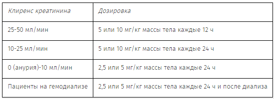 Детям от 3 месяцев до 12 лет с нарушением функции почек требуется коррекция дозы в соответствии со степенью нарушения функции почек (см. таблицу 2).