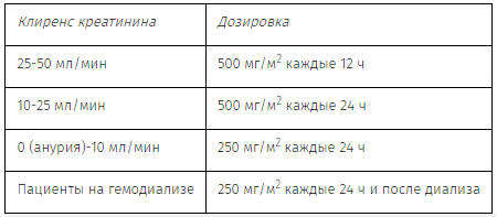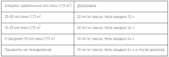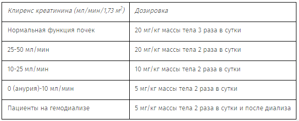 Дозы у пациентов с нарушением функции почек следует рассчитывать согласно таблице 3 для взрослых и детей с 12 лет и таблице 4 для детей от 3 месяцев до 12 лет.
