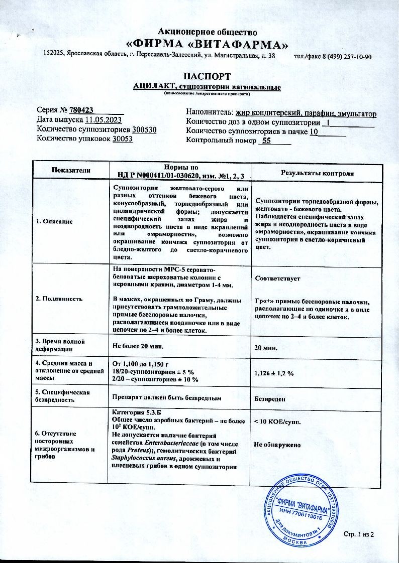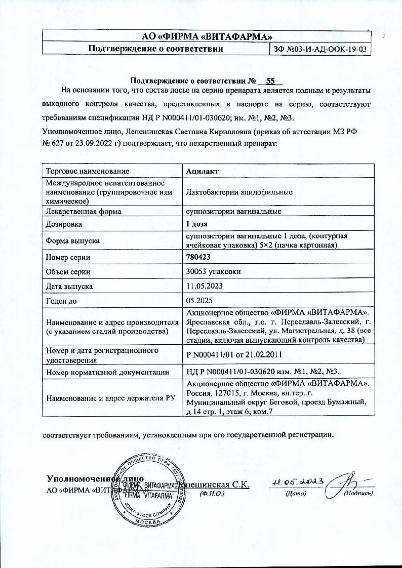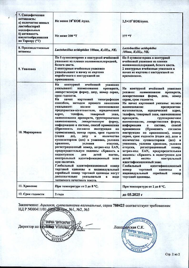 Активное вещество: живые ацидофильные лактобактерии (1 доза) не менее 10 7 .