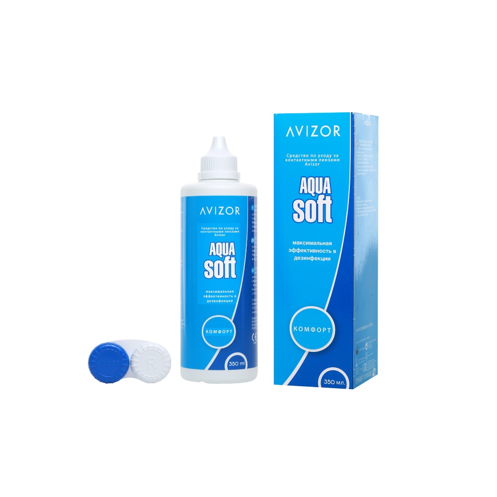 Средства по уходу за контактными линзами Avizor Aquasoft для всех видов контактных линз во флаконах с контейнером для хранения линз.