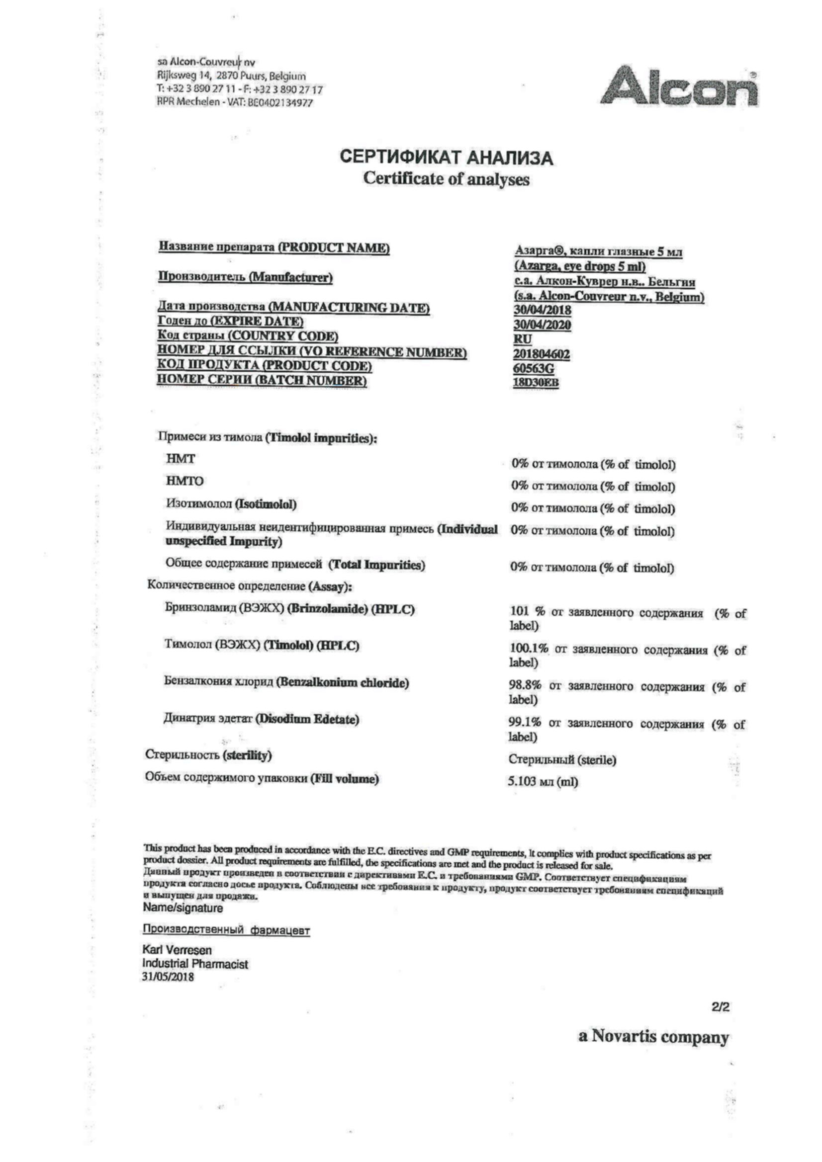 В равновесном состоянии, после применения препарата Азарга средняя максимальная концентрация Сmах тимолола в плазме и AUC0-124 тимолола составляла 0,824 ± 0,453 нг/мл и 4,71 ± 4,29нг*ч/мл, соответственно, а средняя Стах тимолола была достигнута при 0,79 ±0,45 ч.