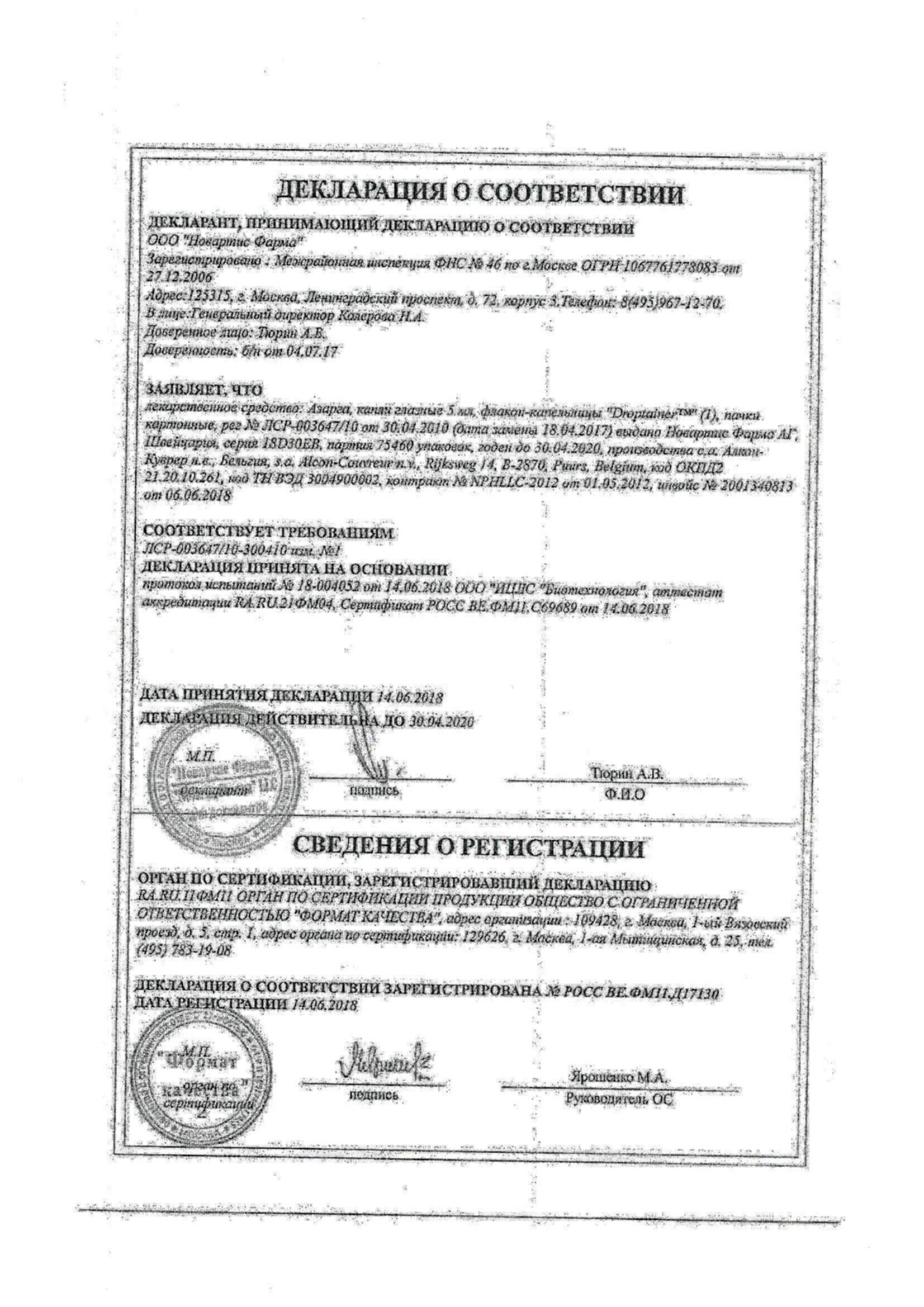 Вспомогательные вещества: бензалкония хлорид (в виде 50 % раствора) 0.1 мг, динатрия эдетат 0.1 мг, натрия хлорид 1 мг, тилоксапол 0.25 мг, маннитол 33 мг, карбомер (974Р) 4 мг, натрия гидроксид и/или кислота хлористоводородная концентрированная для доведения pH, вода очищенная до 1 мл.