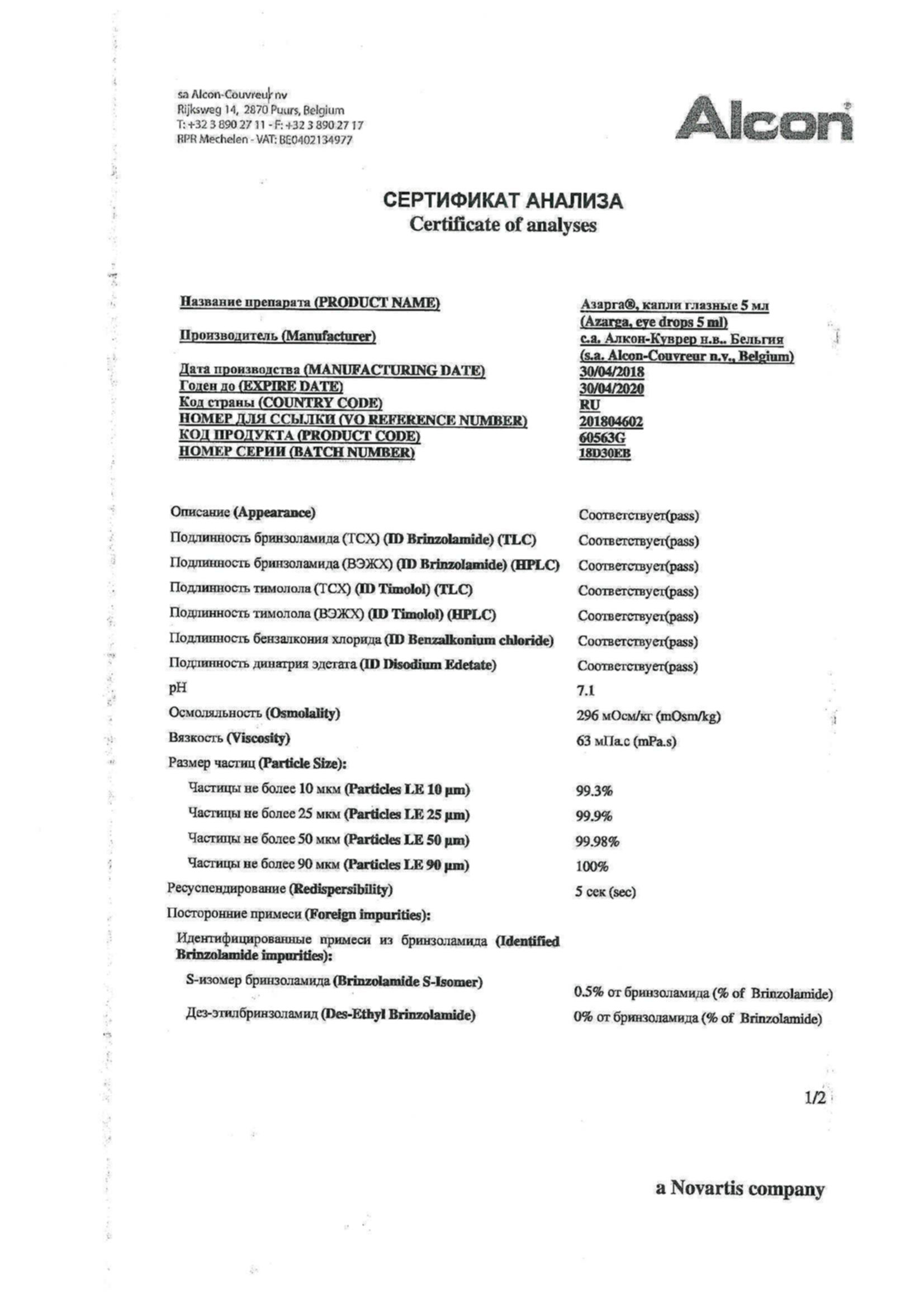 Препарат Азарга содержит бринзоламид, ингибитор карбоангидразы, который при местном применении может абсорбироваться системно. Описаны случаи нарушения кислотно-щелочного равновесия в результате применения пероральных ингибиторов карбоангидразы. Следует учитывать возможность таких нарушений и у пациентов, применяющих препарат Азарга.