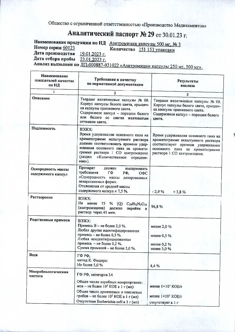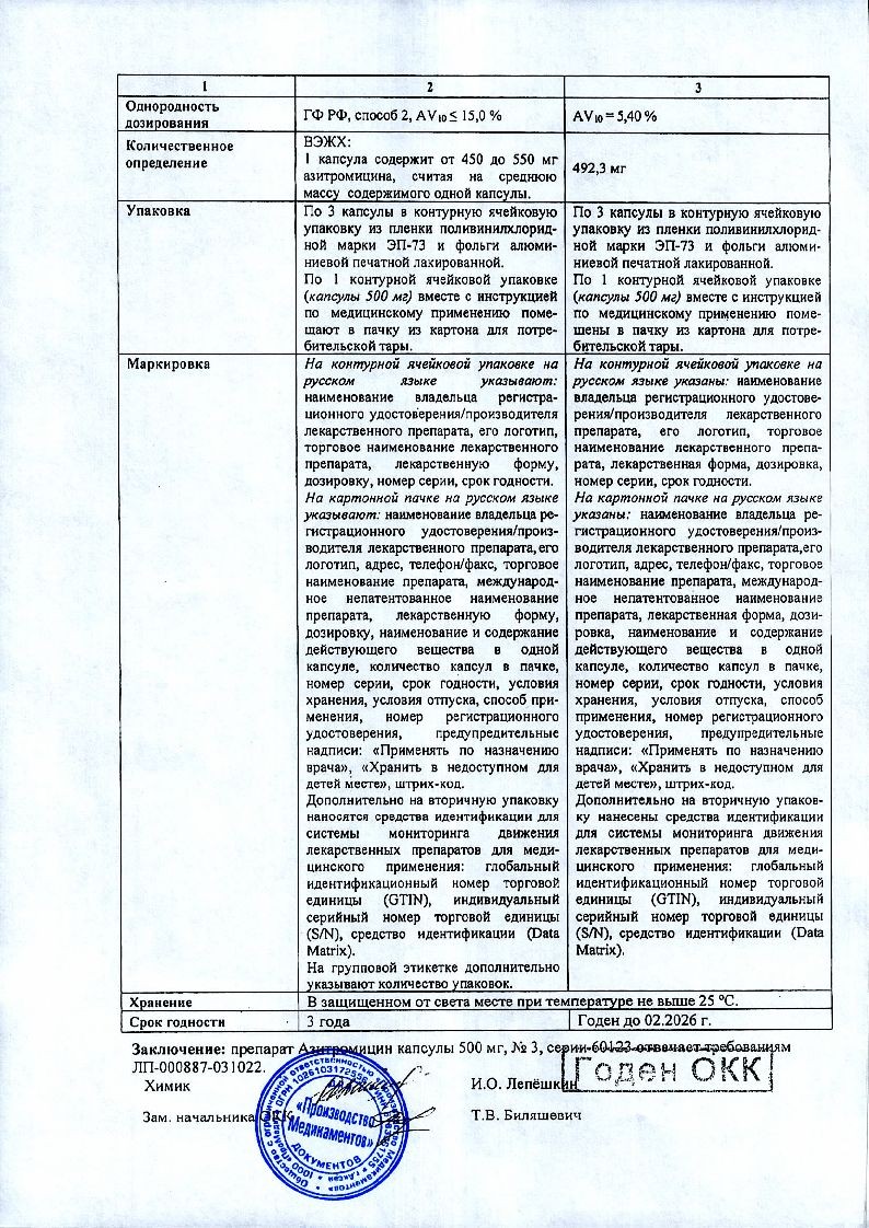 Активное вещество: азитромицина дигидрата (в пересчете на азитромицин) - 500 мг.