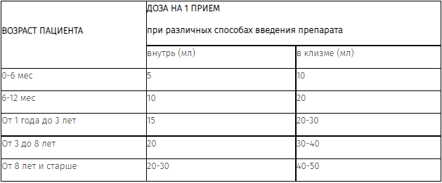 В случаях неукротимой рвоты препарат применяют в виде высоких клизм (через газоотводную трубку или катетер) ежедневно однократно в дозе 5-10 мл. Возможно сочетание ректального (в виде высоких клизм) и перорального применения препарата. Курс лечения 7-15 дней (по клиническим показаниям). При рецидивирующем течении заболевания возможно повторное проведение курсов лечения.