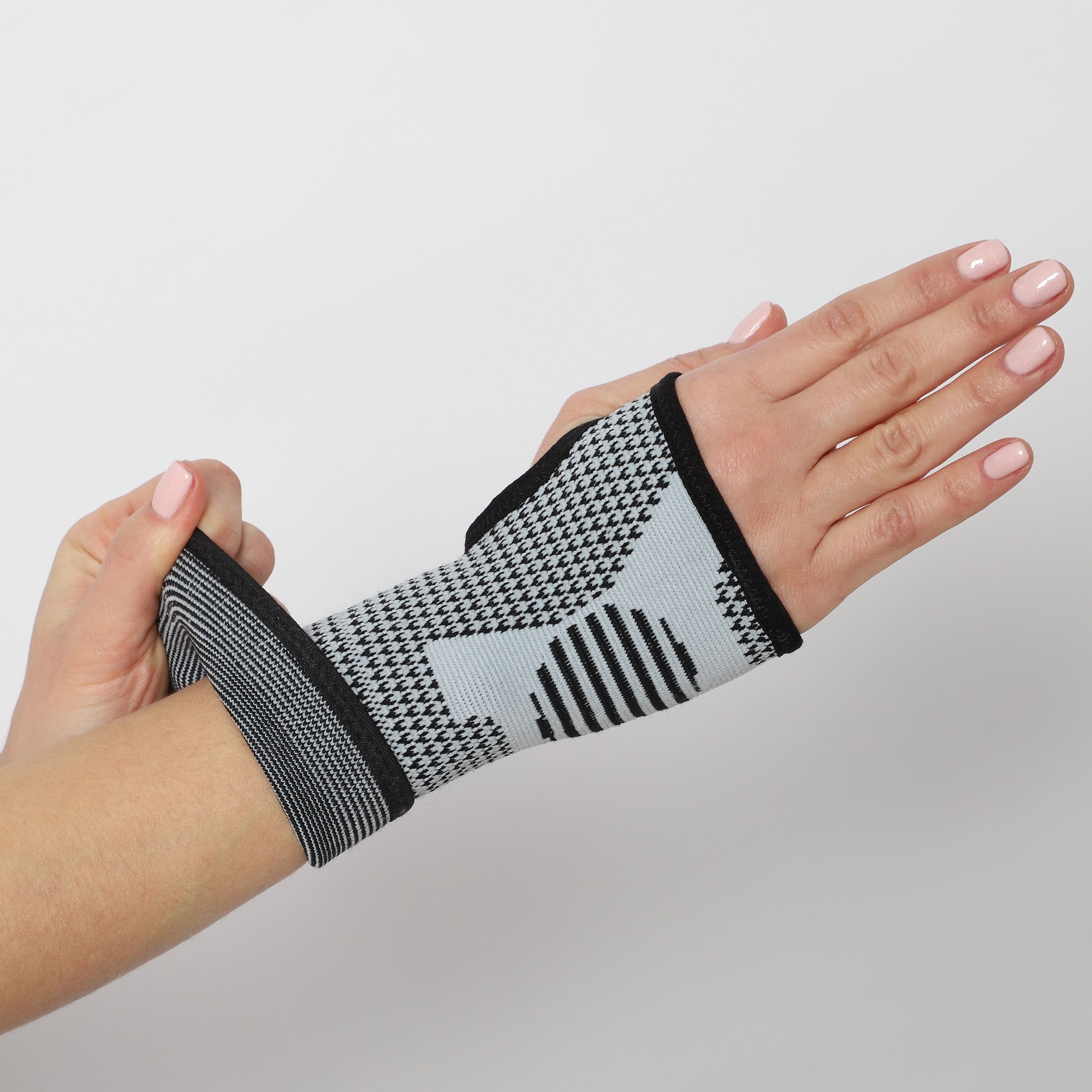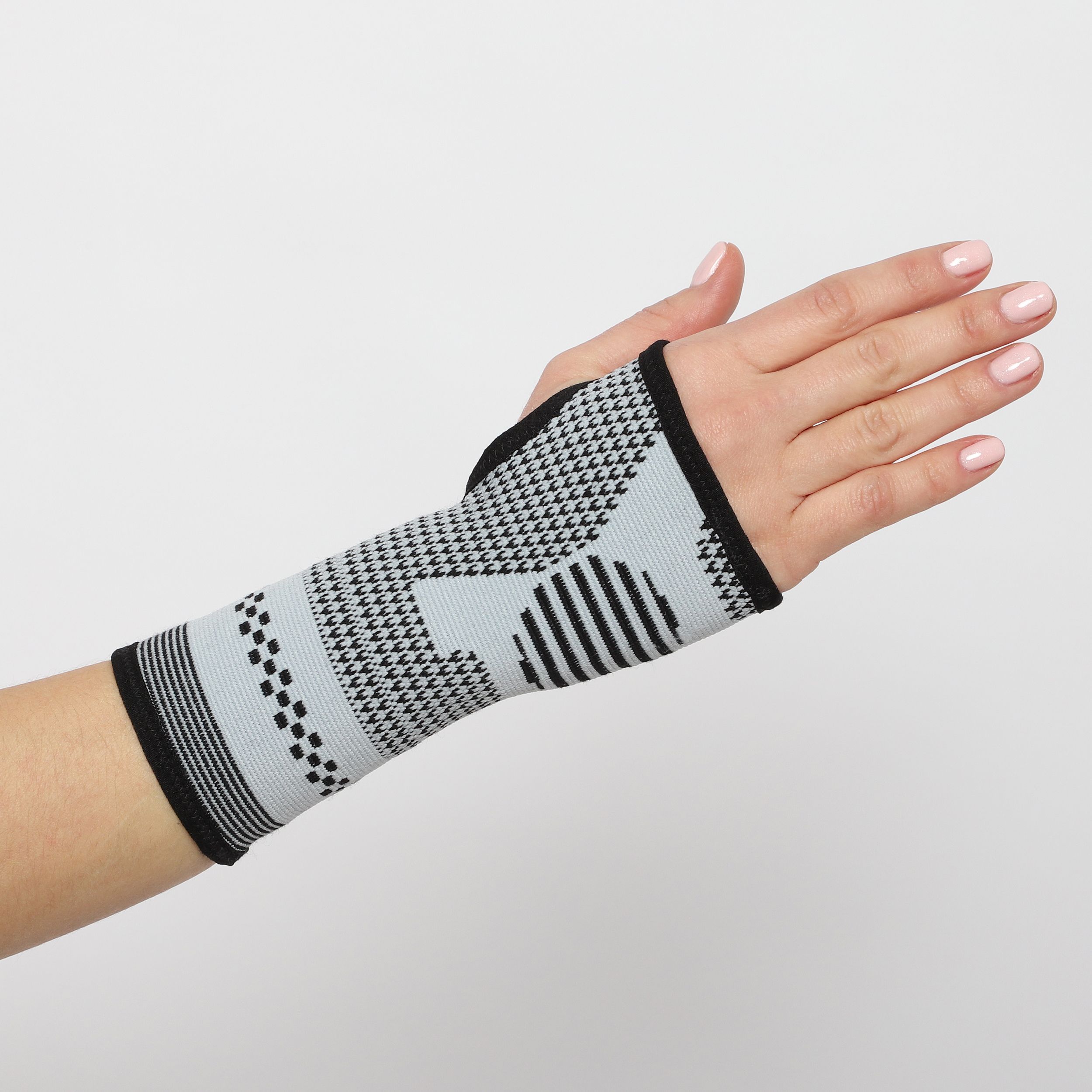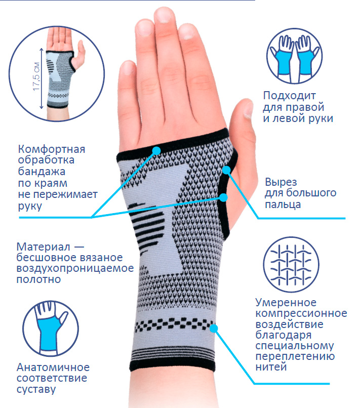 Бандаж плотно облегает лучезапястный сустав и не смещается при движении