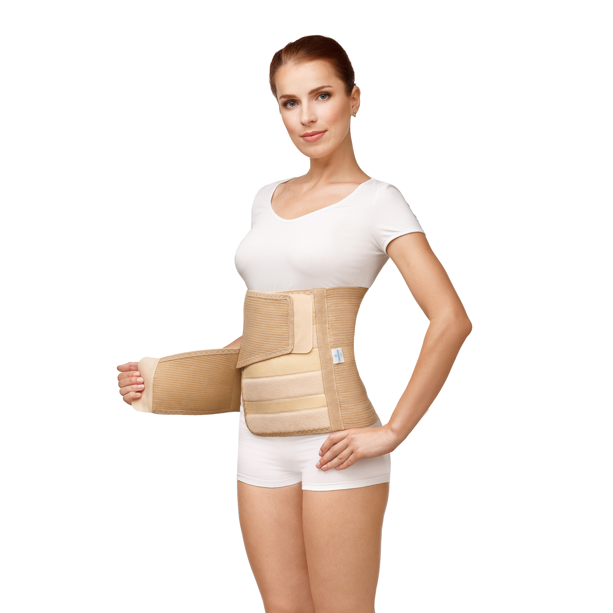 - Двухпанельная застежка облегчает надевание, обеспечивая анатомическое прилегание бандажа к телу.