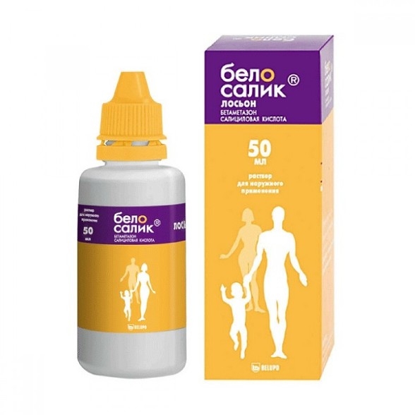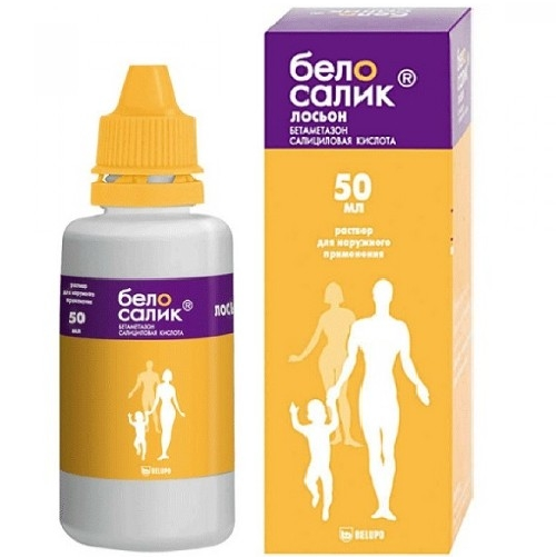 Препарат Белосалик лосьон в форме раствора для наружного применения особенно удобен для использования на коже волосистой части головы. Раствор легко распределяется по поверхности кожи, не склеивает и не высушивает волосы, не оставляет видимых следов, оказывает охлаждающее действие на кожу.