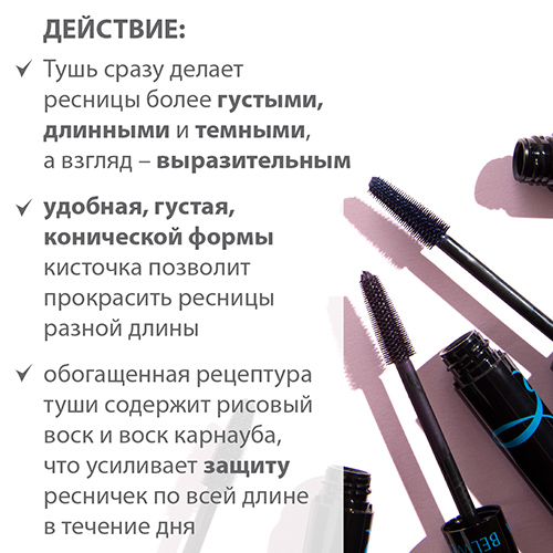 Обогащенная рецептура туши содержит рисовый воск и воск карнауба, что усиливает защиту ресничек по всей длине в течение дня.