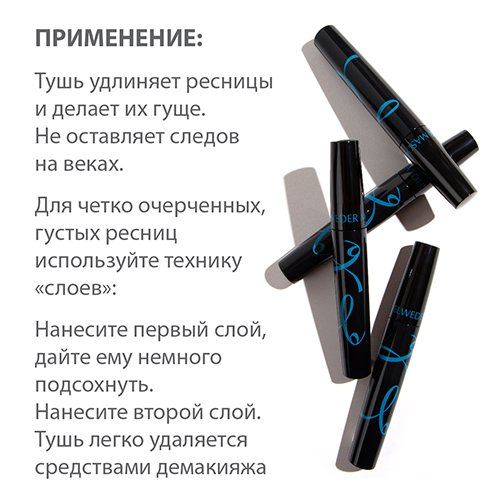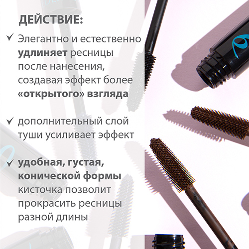 Тушь удлиняет ресницы и делает их гуще. Устойчива к влажности, слезам, поту. Не оставляет следов на веках.