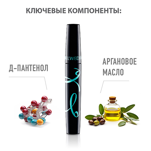 Д-пантенол, воск карнауба, рисовый воск и аргановое масло, входящие в рецептуру туши для ресниц, помогают сохранять и укреплять структуру ресниц, делают их эластичными и блестящими.