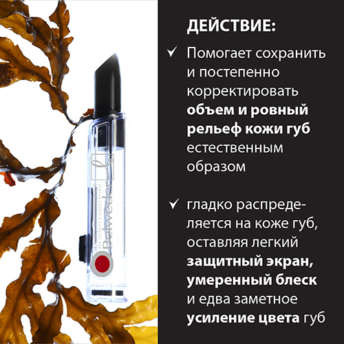 Бальзам с содержанием водорослей и других активных веществ одновременно ухаживает за губами, придает им свежий вид, подчеркивая природный цвет. При хранении на поверхности средства возможно выделение небольших капель влаги. Это естественная реакция природных компонентов на температуру окружающей среды, она не влияет на качества бальзама. В составе этого препарата нет токсичных синтетических веществ, способных вызвать аллергию.