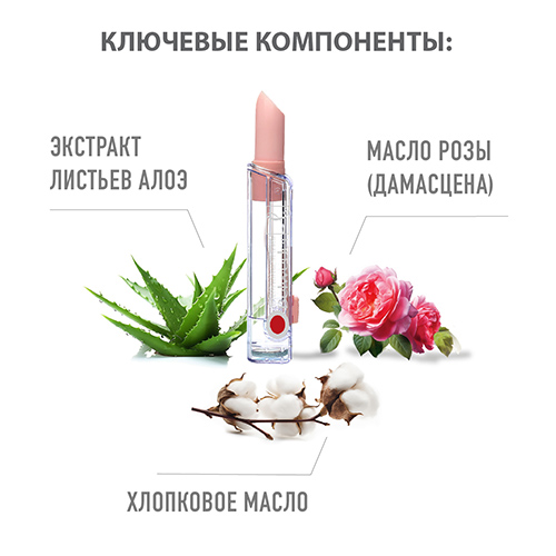 Масла: хлопковое, пальмовое, жожоба, - увлажняют, разглаживают, питают кожу губ. Устраняют симптомы раздражения кожи (шелушение, покраснение, болезненность)