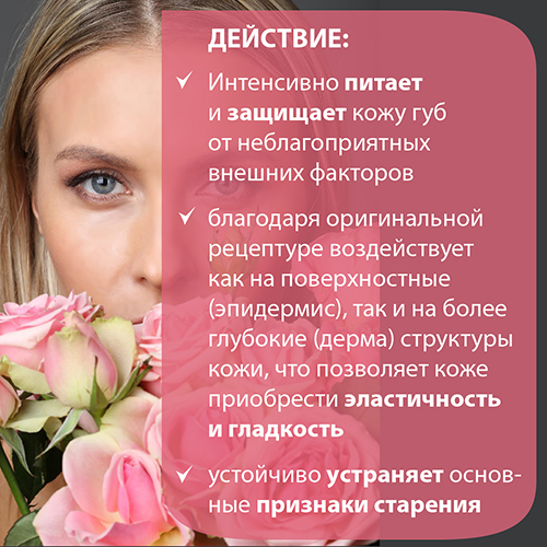 При регулярном использовании устойчиво устраняет основные признаки старения – сухость, потерю упругости и объема, «исчерченность» кожи губ.