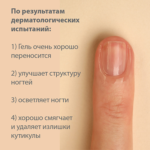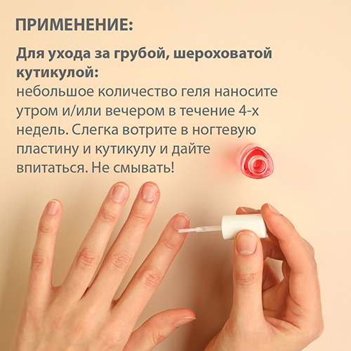 Как средство ухода за грубой, шероховатой кутикулой: небольшое количество геля наносите утром и/или вечером в течение 4-х недель. Слегка вотрите в ногтевую пластину и кутикулу и дайте впитаться. Не смывать!