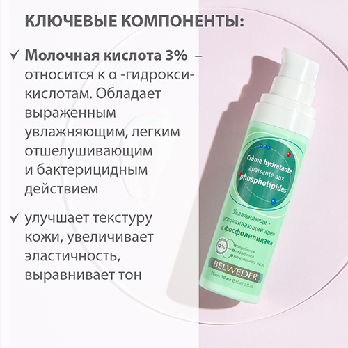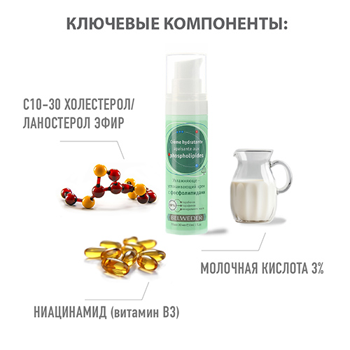 витамин В3 в концентрации 2% - уменьшает трансдермальную потерю воды, принимает участие в регуляции биосинтеза церамидов, улучшает микроциркуляцию крови, предотвращает преждевременное старение;