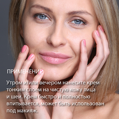 Крем наносите на чистую кожу лица и шеи 1-2 раза в день. Распределите крем тонким слоем массирующими движениями до полного впитывания.