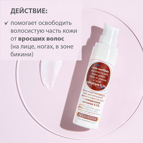 помогает освободить волосистую часть кожи от вросших волос (на лице, ногах, в зоне бикини)