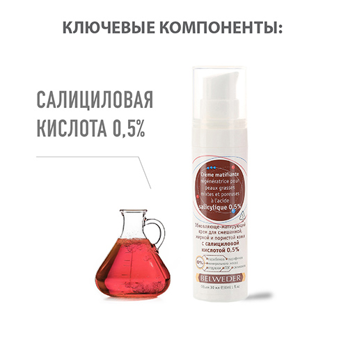 Благодаря салициловой кислоте в концентрации 0,5%, крем хорошо переносится и обладает эффективным, но мягким кератолитическим (отшелушивающим), противовоспалительным, антибактериальным действием.
