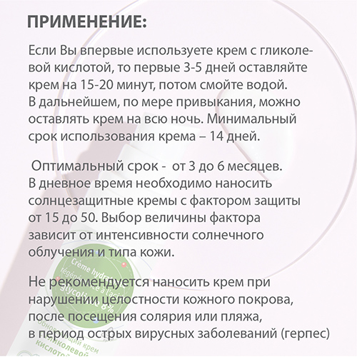 На чистую и сухую кожу лица (обходя область глаз и слизистых), шеи и зоны декольте нанесите небольшое количество крема. После нанесения на кожу крем может вызвать пощипывание/покалывание и легкое покраснение. Это нормальное, проходящее ощущение, связанное с быстрым действием гликолевой кислоты. Если появилась выраженная гиперемия (покраснение кожи), это не будет иметь негативных последствий – достаточно смыть крем водой В дневное время необходимо наносить солнцезащитные кремы с фактором защиты от 15 SPF до 50 SPF. Выбор величины фактора зависит от интенсивности солнечного облучения и типа кожи Не рекомендуется наносить крем при нарушении целостности кожного покрова, после посещения солярия или пляжа, в период острых вирусных заболеваний (герпес).