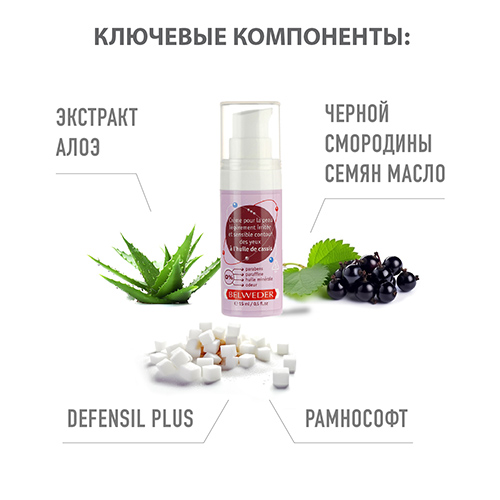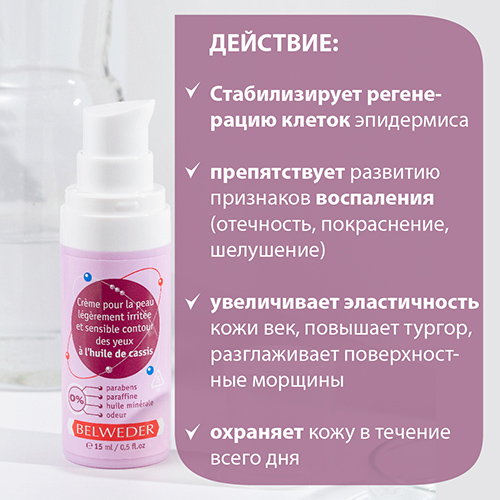 - Увеличивает эластичность кожи век, повышает тургор, разглаживает поверхностные морщины