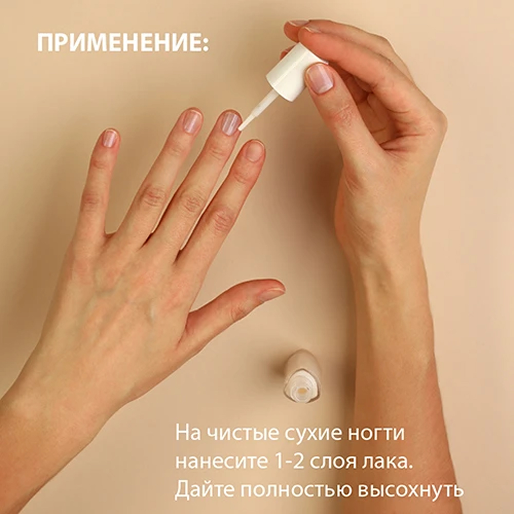 На чистые сухие ногти нанесите лак в 1-2 слоя. Дайте полностью высохнуть. Можно использовать самостоятельно или как базу.
