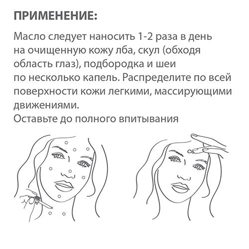 Масло следует наносить 1 — 2 раза в день на очищенную кожу лба, скул, подбородка (обходя область глаз) и шеи по несколько капель. Распределите по всей поверхности кожи легкими, массирующими движениями. Оставьте до полного впитывания