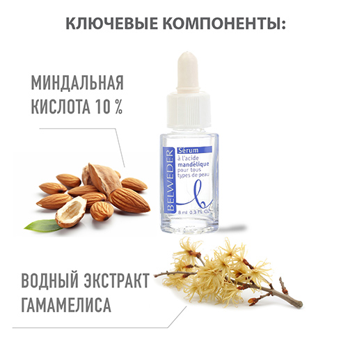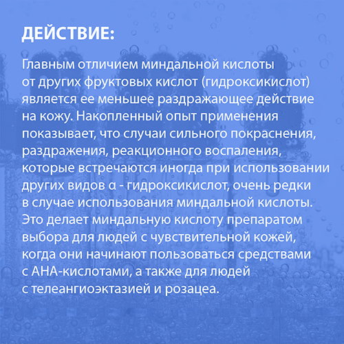 Миндальная кислота 10% - получается из косточек горького миндаля (Amygdalus Communis var Amara)- является α–гидроксикислотой с относительно крупной молекулой, что обеспечивает мягкое, но эффективное действие: