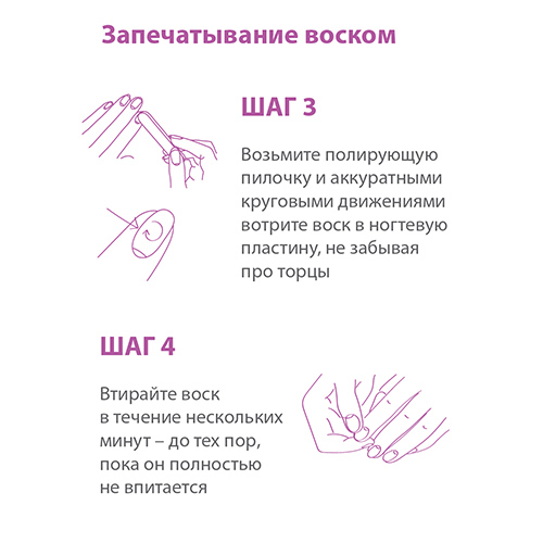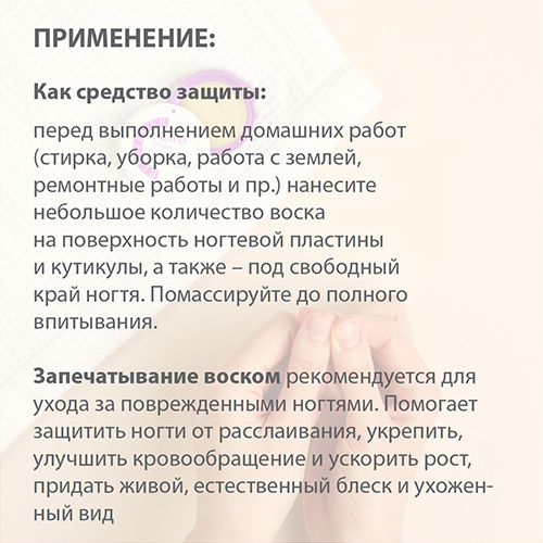 Как средство ухода: перед сном на чистые ногти и/или кутикулу нанесите небольшое количество воска.