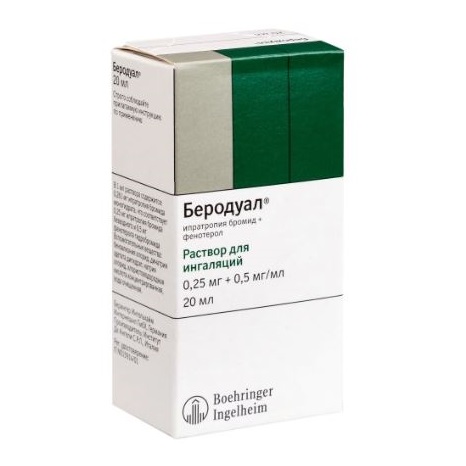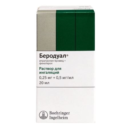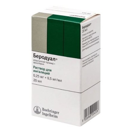 БЕРОДУАЛ содержит два компонента, обладающих бронхолитической активностью: ипратропия бромид - м-холиноблокатор, и фенотерол - 2-адреномиметик.