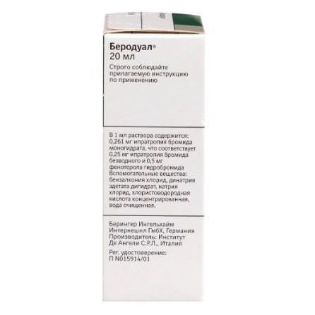 При совместном применении этих двух активных веществ бронхорасширяющий эффект достигается путем воздействия на различные фармакологические мишени. Указанные вещества дополняют друг друга, в результате усиливается спазмолитический эффект на мышцы бронхов и обеспечивается большая широта терапевтического действия при бронхолегочных заболеваниях, сопровождающихся констрикцией дыхательных путей. Взаимодополняющее действие таково, что для достижения желаемого эффекта требуется более низкая доза -адренергического компонента, что позволяет индивидуально подобрать эффективную дозу при практическом отсутствии побочных эффектов. БЕРОДУАЛ. При острой бронхоконстрикции эффект БЕРОДУАЛА развивается быстро, что позволяет использовать его при острых приступах бронхоспазма.