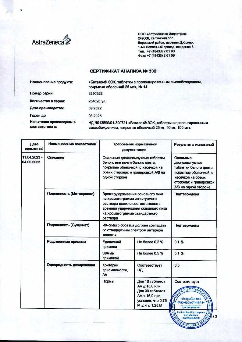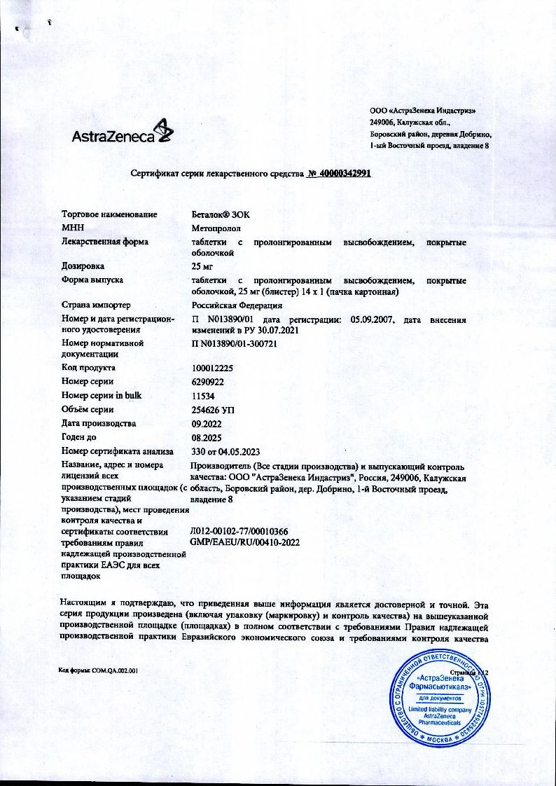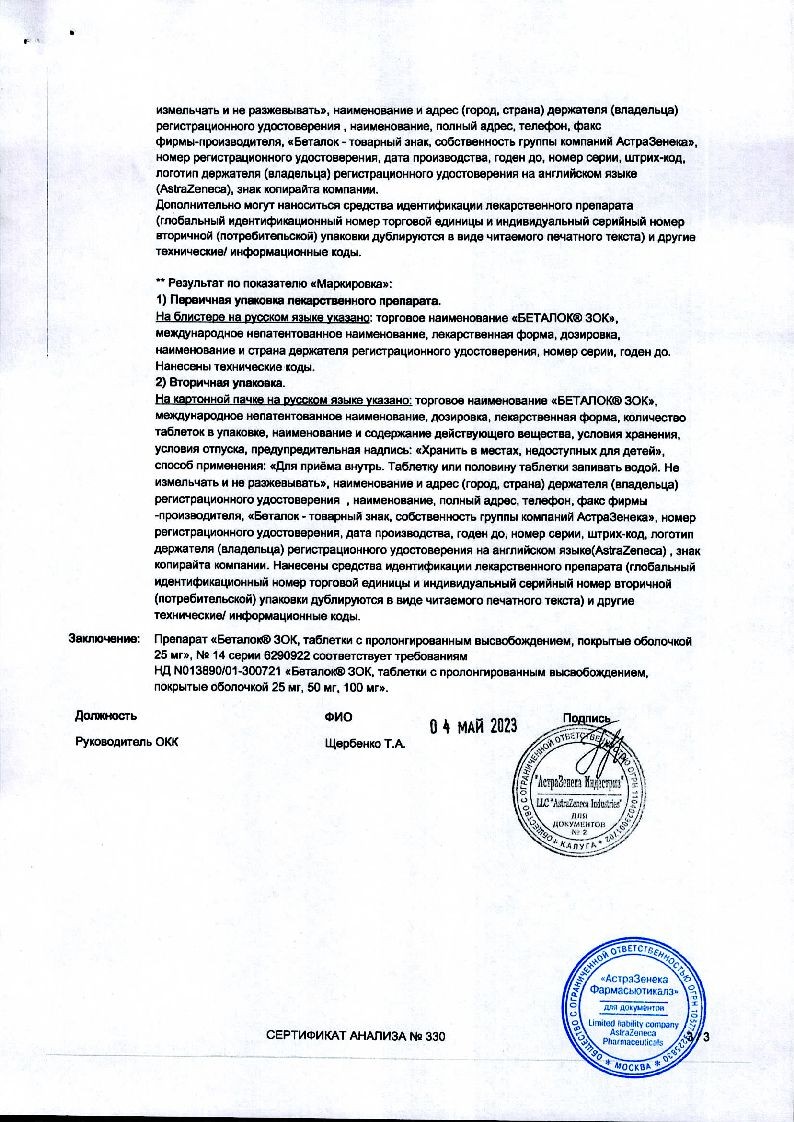 Беталок® ЗОК, 25 мг, таблетки с пролонгированным высвобождением, покрытые оболочкой