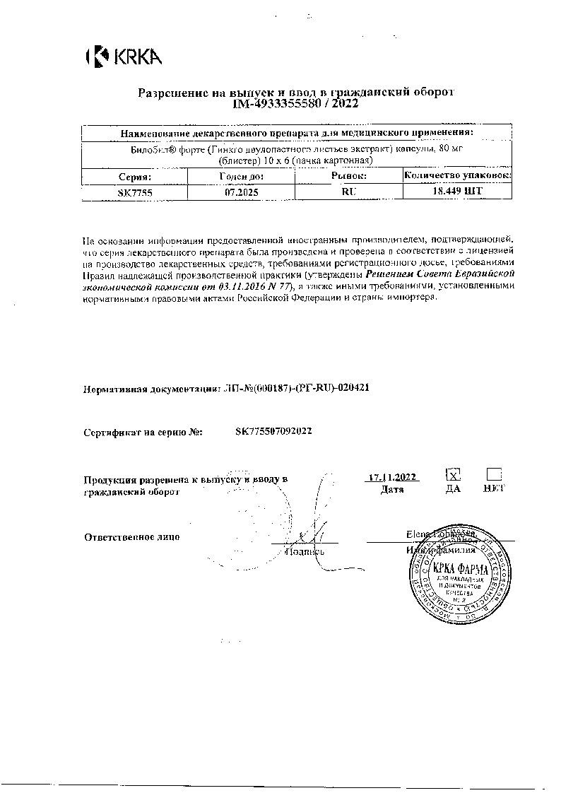 Препарат Билобил® форте содержит краситель азорубин (Е122), который может вызвать развитие аллергических реакций и бронхоспазма.