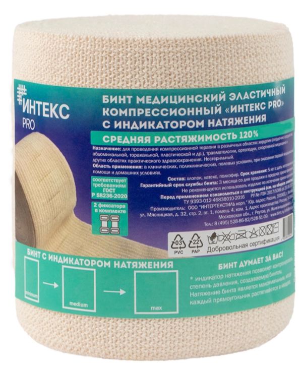 Главной особенностью эластичных бинтов "Интекс-PRO" является запатентованный индикатор давления в виде прямоугольника, который показывает степень натяжения бинта во время бинтования. Это позволяет правильно распределять давление на тело. Эластичные бинты средней растяжимости могут растягиваться до 120% от первоначальной длины, и это позволяет эффективно применять бинты для компрессионной терапии при варикозной болезни вен нижних конечностей, восстановления после травм и операций, защиты суставов во время занятия спортом. Компрессионные бинты Интекс-PRO содержат более 90% хлопка. Это придаёт бинтам «Интекс-PRO» мягкость и обеспечивает повышенный комфорт в использовании по сравнению с обычными эластичными бинтами. Изготовленные по тканной технологии, бинты «Интекс-PRO» гораздо прочнее обычных эластичных бинтов, а оверлок краёв предохраняет бинты от роспуска и усадки после стирки. Две металлические застёжки-фиксатора надёжно фиксируют бинт на теле и минимально деформируют ткань в отличие от «липучек», которые «махрят» бинт, вытягивая из него нити.