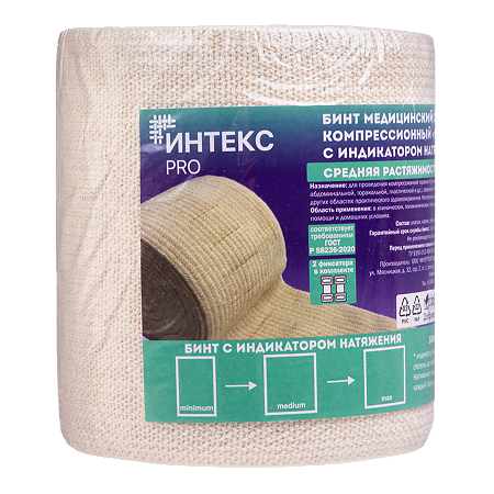 Бинт медицинский эластичный, ленточный, компрессионный предназначен для профилактики и лечения варикозного расширения вен, вывихов, растяжений и отеков. Рекомендуется для поддержания мягких тканей после снятия гипса, проведения компрессионной терапии после склеротерапии и других операций на венах. Может быть использован в качестве дополнительной фиксирующей повязки на рану, а также как бинты для обертывания в косметологии. Главной особенностью компрессионных эластичных бинтов ИНТЕКС Pro является запатентованный индикатор давления в виде прямоугольника, который показывает степень натяжения бинта во время бинтования. Это позволяет контролировать степень натяжения бинта и правильно распределять давление на тело. Компрессионные эластичные бинты ИНТЕКС Pro содержат более 80% хлопка. Это придаёт бинтам мягкость и обеспечивает повышенный комфорт в использовании по сравнению с обычными эластичными бинтами. Изготовленные по тканной технологии, бинты ИНТЕКС Pro гораздо прочнее обычных эластичных бинтов, а оверлок краёв предохраняет бинты от роспуска и усадки после стирки. Эластичные бинты ИНТЕКС Pro имеют две металлические застёжки-фиксатора, которые надёжно фиксируют бинт на теле и минимально деформируют ткань в отличие от «липучек», которые «махрят» бинт, вытягивая из него нити.