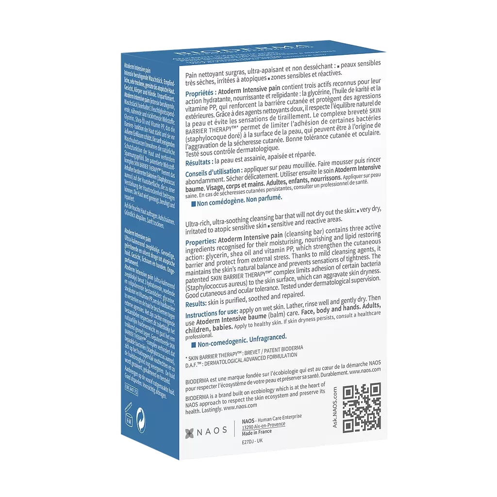 Мыло Bioderma Atoderm Intensive увлажняет, питает и восстанавливает липидный баланс поврежденной кожи. Не содержит отдушки и ингредиентов, вызывающих аллергические реакции. В основе — мягкая очищающая база, что позволяет избежать ощущения стянутости и чрезмерной сухости.