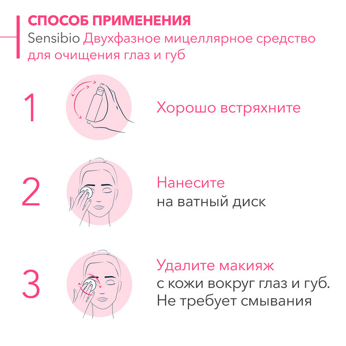 Тщательно встряхните перед использованием. Смочите ватный диск и очистите кожу контура глаз и губ. Не смывайте.
