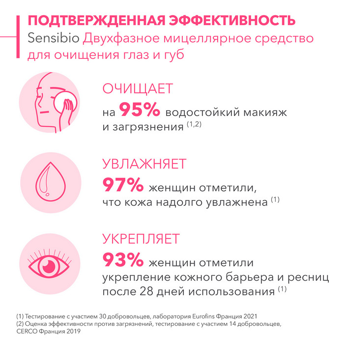 Двухфазное мицеллярное средство для деликатного очищения водостойкого макияжа и загрязнения для чувствительной кожи глаз и губ. Очищает водостойкий макияж и загрязнения. Оказывает мгновенное успокаивающее действие. Глубоко увлажняет. Укрепляет кожный барьер и укрепляет ресницы. Физиологический PH. Предупреждает появление чувствительности. Не требует смывания.