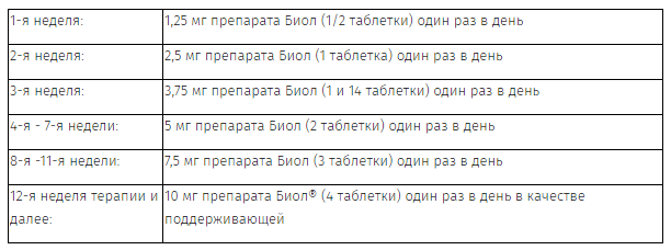 Лечение ХСН препаратом Биол® начинается в соответствии со следующей схемой титрования. При этом может потребоваться индивидуальная адаптация в зависимости от того, насколько хорошо пациент переносит назначенную дозу, т. е. дозу можно увеличивать только в том случае, если предыдущая доза хорошо переносилась.