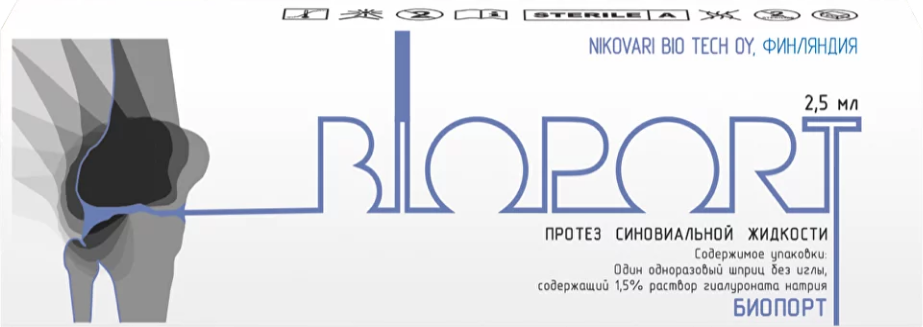 Протез синовиальной жидкости Биопорт (Bioport) предназначен для лечения болей при остеоартрите колена для пациентов, не показавших адекватного ответа на консервативное нефармакологическое лечение, а также на легкие анальгетики, такие как ацетаминофен. Действие Bioport заключается в повышении вязкоупругости синовиальной жидкости, снижении воспалительной реакции, защите тканей сустава, а также снижении боли при остеоартрите при введении путем внутрисуставных инъекций.