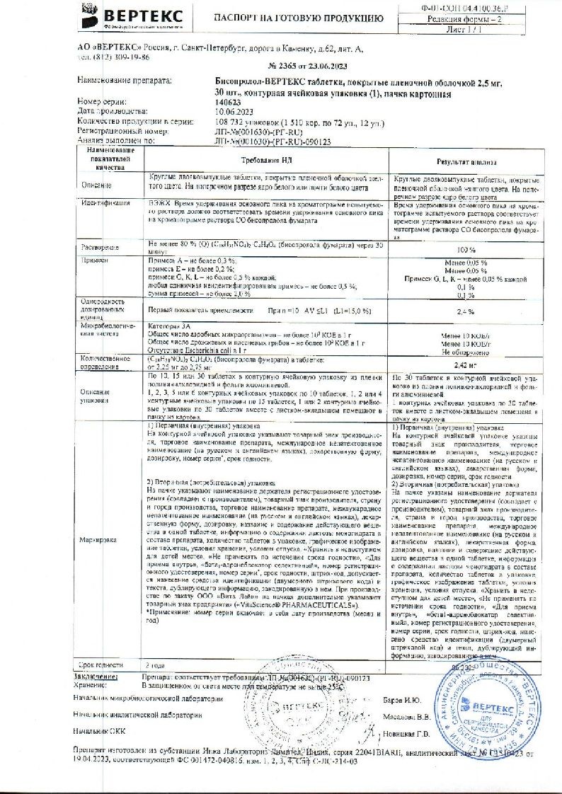 действующее вещество: бисопролола фумарат - 2,5 мг;