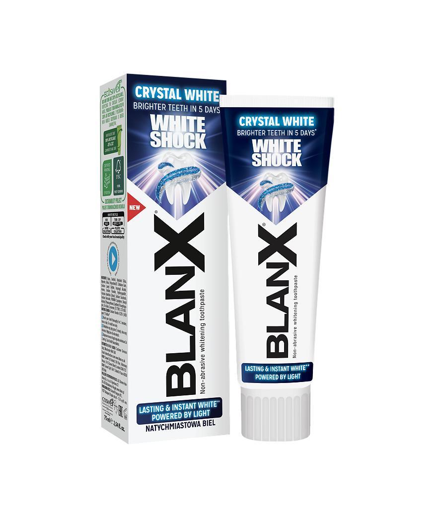 Отбеливающая зубная паста White Shock Бланкс на основе инновационной формулы Actilux очищает и защищает зубную эмаль в течение всего дня, уничтожая вредные бактерии. Под действием дневного света запатентованная формула зубной пасты активируется и оказывает мягкий и безопасный отбеливающий эффект. Паста способна помочь справиться с пятнами на зубной эмали, вызванными употреблением кофе, чая и красного вина. Действует BlanX White Shock 24 часа, а ее эффект заметен уже после первых применений. При этом отбеливание происходит естественно и безопасно &mdash: без абразива и перекисных соединений.