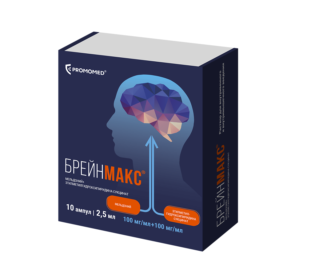 В клинических исследованиях показано, что препарат БРЕИНМАКС® по сравнению с монокомпонентами (мельдонием и этилметилгидроксипиридина сукцинатом) оказывает более выраженное положительное влияние на состояние пациентов с ишемическим инсультом в остром и раннем восстановительном периоде, повышая уровень дееспособности и мобильности пациентов, значительно уменьшая выраженность когнитивных нарушений и улучшая неврологический статус.