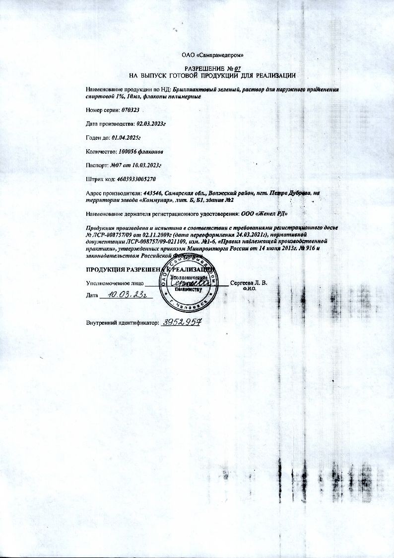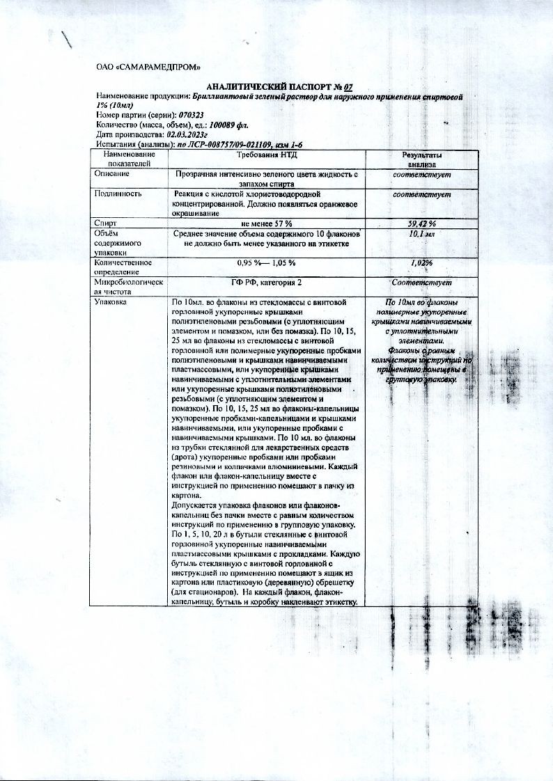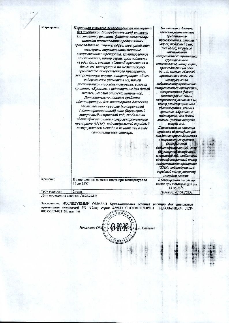 Раствор бриллиантового зеленого несовместим с дезинфицирующими средствами, содержащими активный йод, хлор, щелочи, включая раствор аммиака.