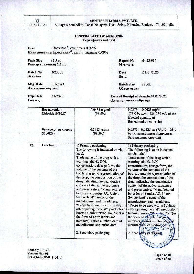 Бромфенак эффективно проникает в роговицу: при однократной инстилляции концентрация в водянистой влаге глаза составляет 79 ± 68 нг/мл через 150-180 минут после применения препарата. Указанная концентрация сохраняется в течение 12 часов в водянистой влаге глаза с сохранением терапевтически значимой концентрации в тканях глаза, включая сетчатку, до 24 часов.