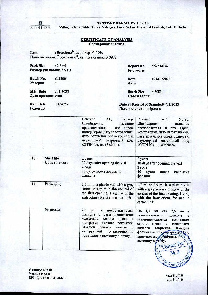 Активное вещество: бромфенака натрия сесквигидрат 1,035 мг, эквивалентно 0,9 мг бромфенака.