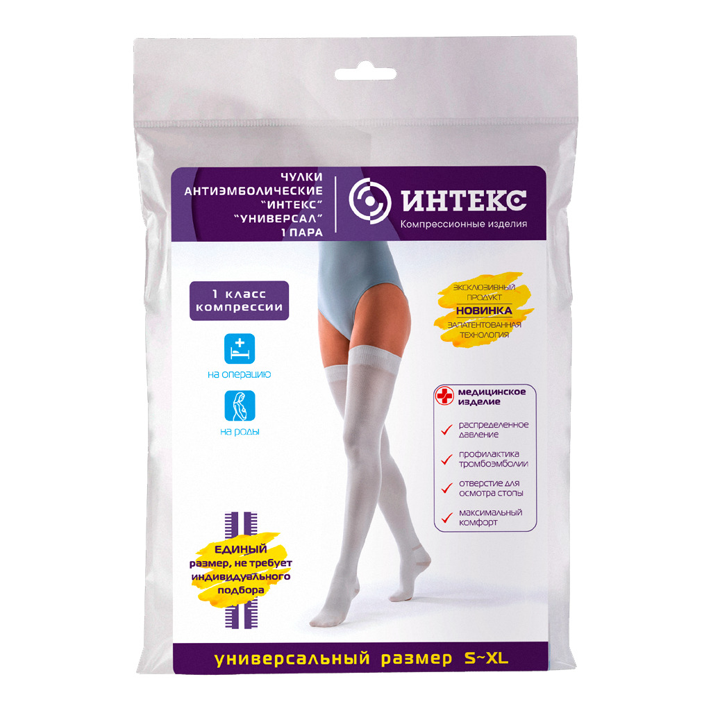 Антиэмболические компрессионные чулки на роды и операцию Интекс Универсал 1 класс компрессии (18-21 мм.рт.ст.) идеально подходят для мужчин и женщин. Уникальная запатентованная технология производства позволит не ошибиться с подбором размера. Вне зависимости от параметров и фигуры в границах размеров S-XL гарантированно сохраняется 1 класс компрессии. Модель комфортно садится на широкое бедро и нестандартные размеры. Антиэмболические чулки помогают для профилактики тромбозов нижних конечностей и тромбоэмболии артерий во время и после операций и родов, а также у лежачих больных в условиях больничного стационара.