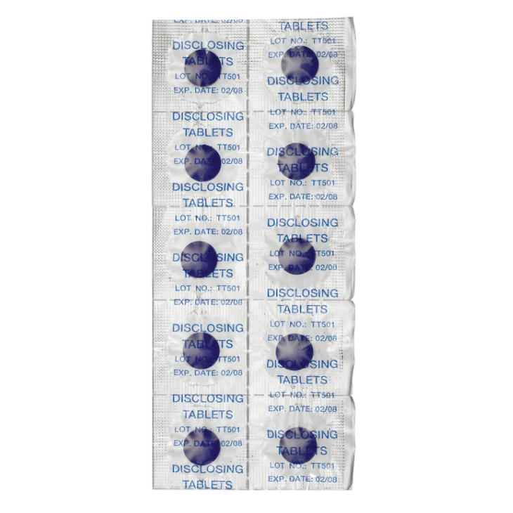 Индикатор зубного налета в таблетках. Используется для коррекции навыков гигиены и выявления некорректной гигиены полости рта у разных групп пациентов. Окрашивает неочищенные поверхности зубов в два цвета. Свежий, мягкий зубной налет окрашивается в розовый цвет, старый структурированный зубной налет окрашивается в темно-синий цвет. Используется для обучения и контроля гигиены полости рта.