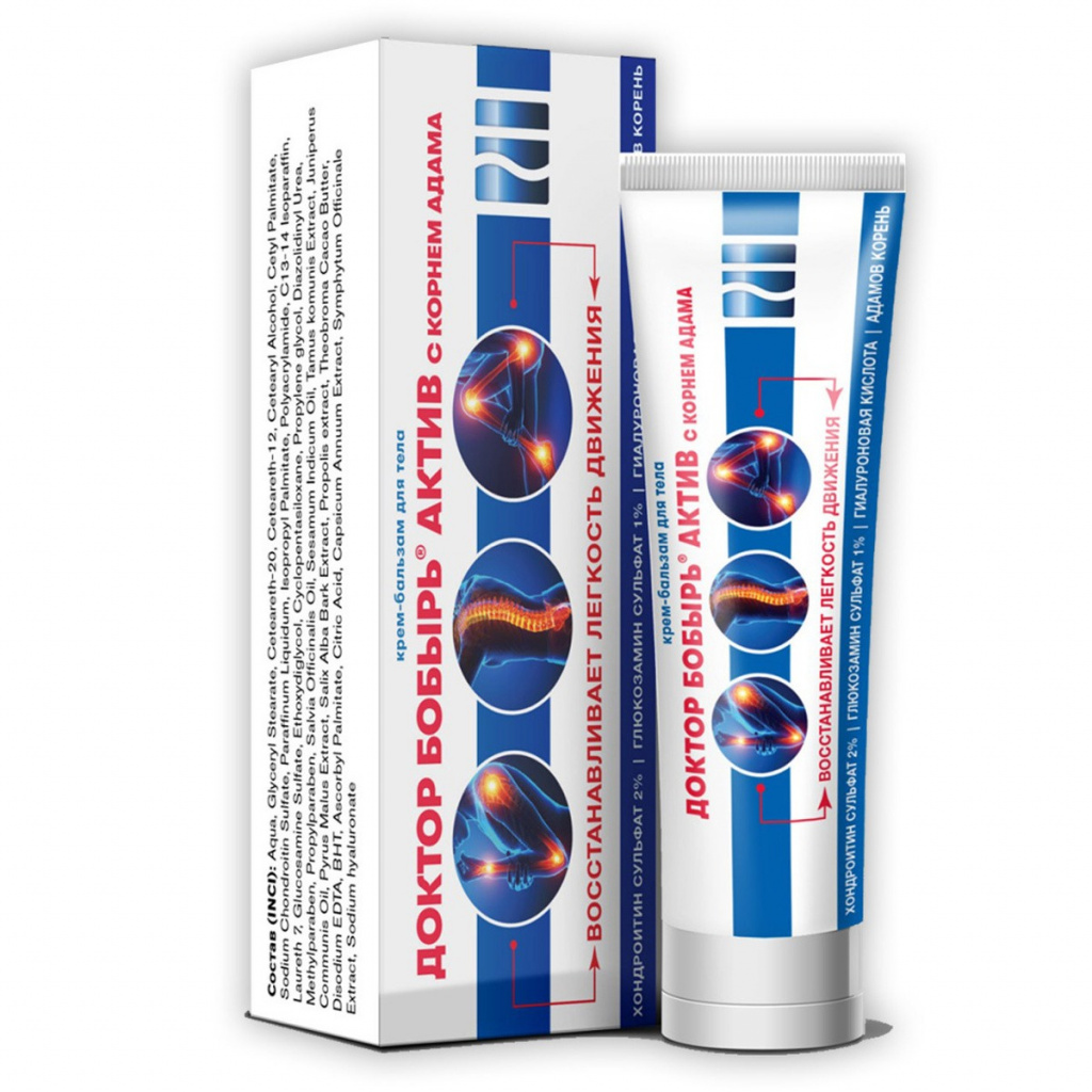 Крем-бальзам для тела Доктор Бобырь АКТИВ с корнем Адама предназначен для эффективного и быстрого избавления от боли в суставах и в позвоночнике. Оказывает сильное противовоспалительное действие при артритах различной этиологии и артрозах; способствует понижению дозы употребляемых нестероидных противовоспалительных препаратов и гормонов. В составе крем-бальзама Доктор Бобырь АКТИВ с корнем Адама присутствуют натуральные растительные и природные компоненты, способные уменьшить или снять боль, воспаление, улучшить питание тканей в больной области, притормозить прогрессирование болезни.